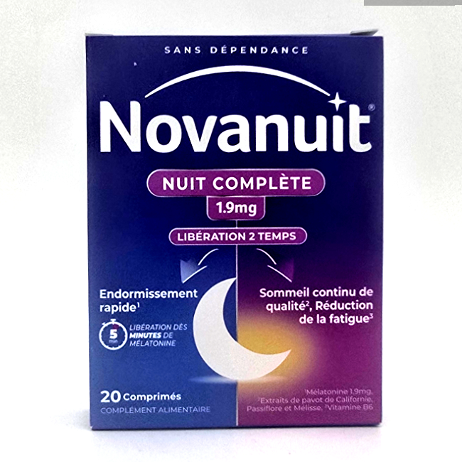 Découvrez Novanuit Nuit Complète, le complément alimentaire Sanofi à double action pour un endormissement rapide et un sommeil réparateur toute la nuit. Grâce à sa technologie de libération bi-phase, 1,9 mg de mélatonine agit dès 5 minutes puis en continu, associé aux extraits de plantes (pavot de Californie, passiflore, mélisse) et à la vitamine B6.