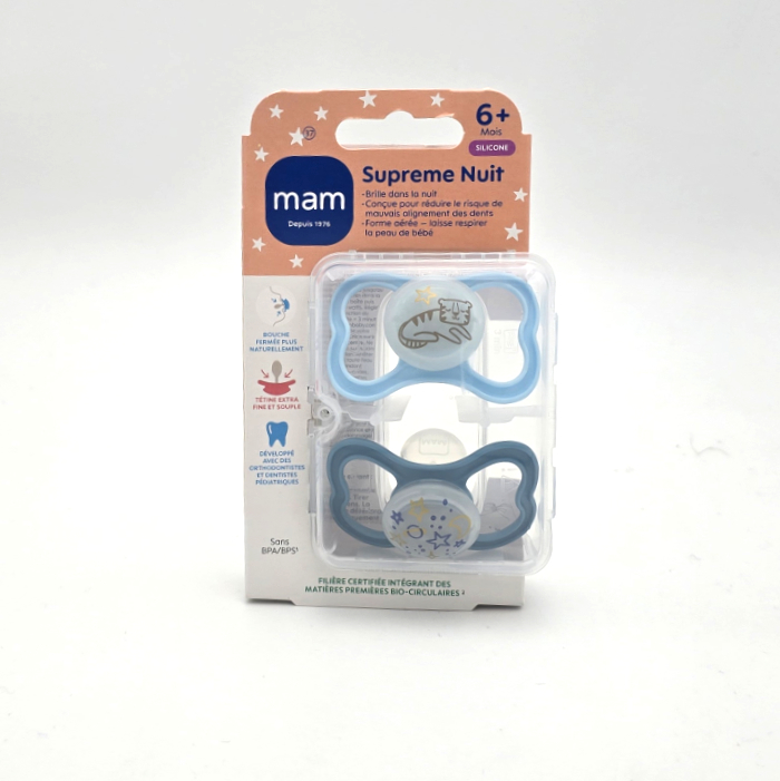 Une étude à long terme a confirmé que la tétine MAM Perfect des sucettes MAM Suprême réduisait le risque de malposition dentaire par rapport aux sucettes traditionnelles. (Étude clinique : Allemagne, 2016, n = 86).- Sans BPA/BPS : Tous les produits MAM sont fabriqués à partir de matériaux sans BPA ni BPS.